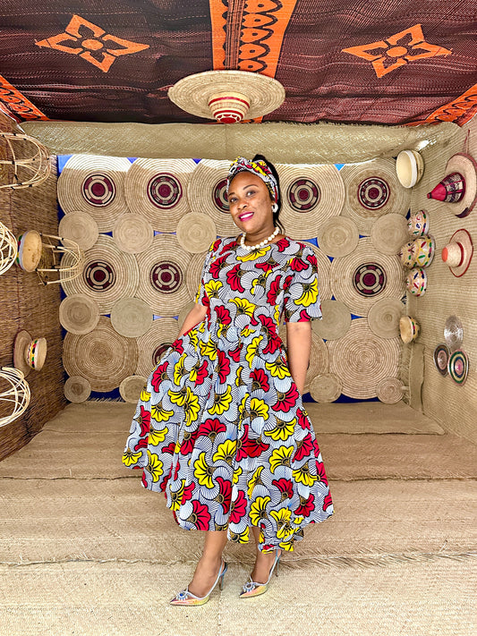 African Ankara White Short Sleeve Fit & Flare Midi Dress Style For Ladies