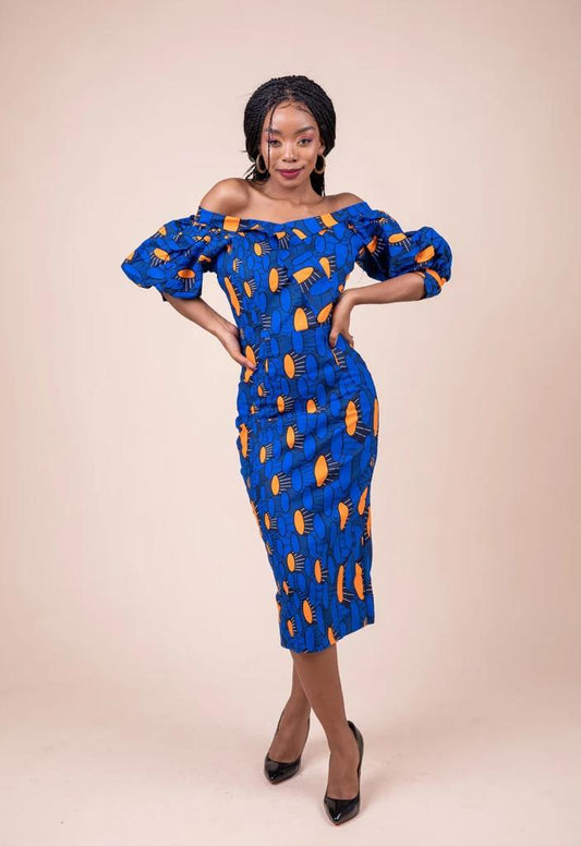 Blue African Ankara Clothing Midi Dress Style For Plus Size Women