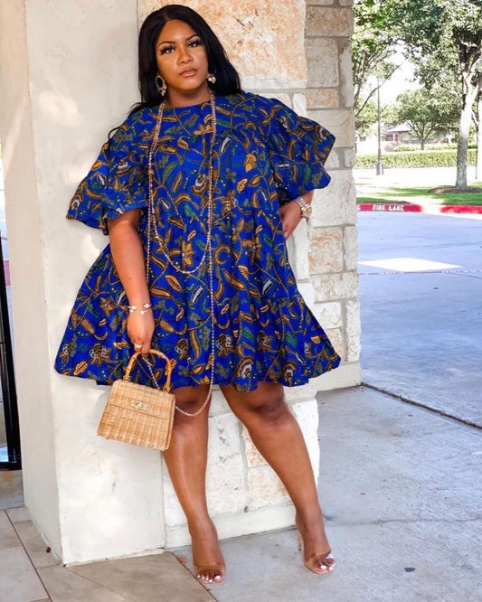 Blue African Ankara Print Plus Size Clothing Party Shirt Dress