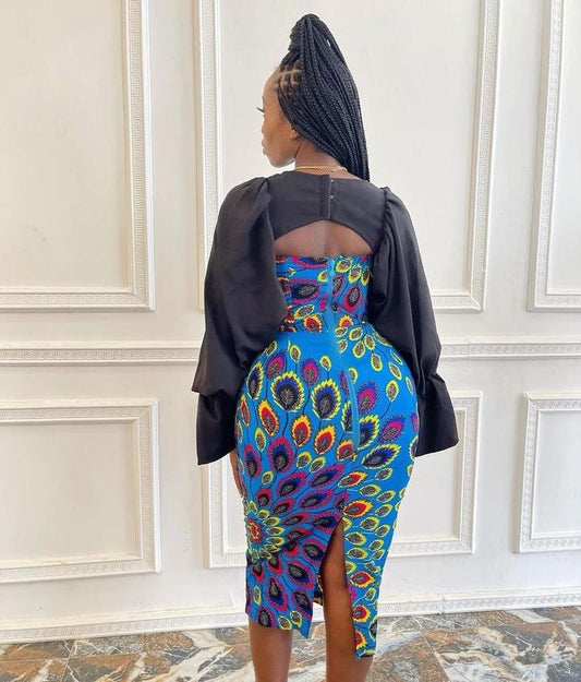 Blue African Ankara Print Long Sleeve Fitted Party Dress