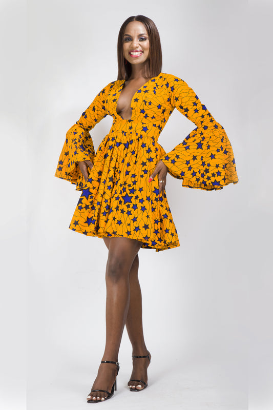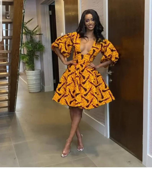 Yellow Blue African Ankara Print Short Party Dress