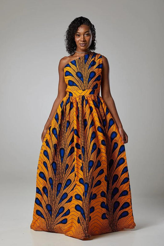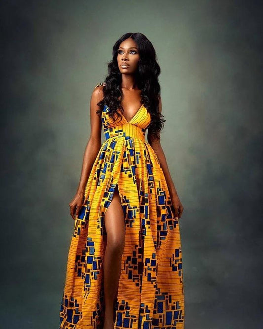 Yellow, Blue Multi African Ankara Print Plus Size Clothing Party Maxi Dress