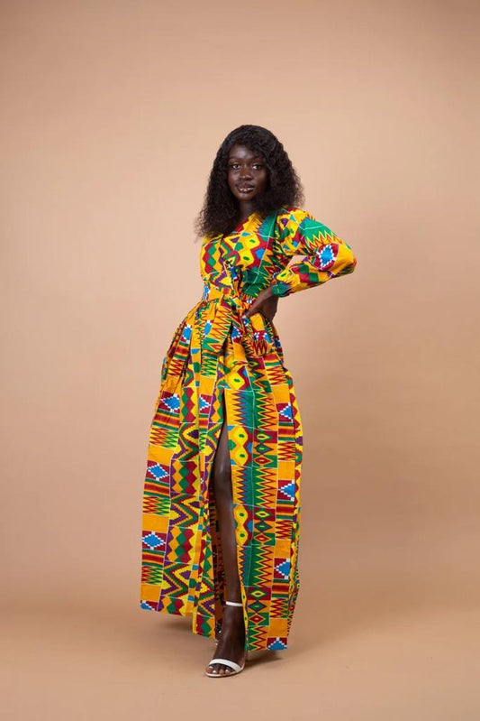 Yellow Multi Long African Kente Ankara Print Long Shirt Dress