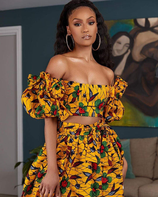 Yellow Flowery Two Piece Top And Skirt African Ankara Party Outfit