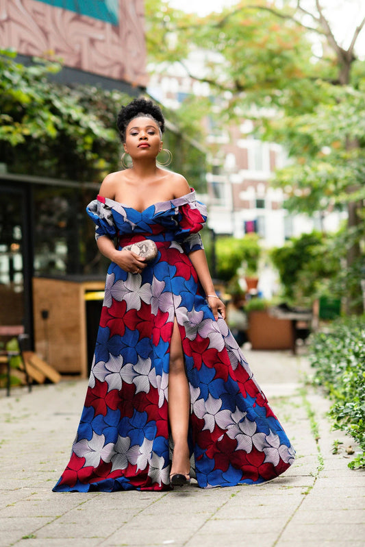 Blue Off-Shoulder African Ankara Print Maxi Dress