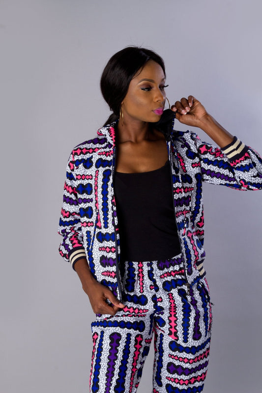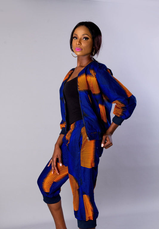 Blue Orange African Ankara Print Plus Size Bomber Jacket Set/African Print Jogger Set/Ankara Print Two-Print Clothing