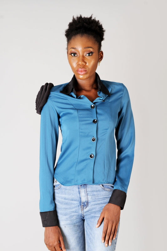 Blue Black Rose Long Sleeve Fitted Statement Shirt Top