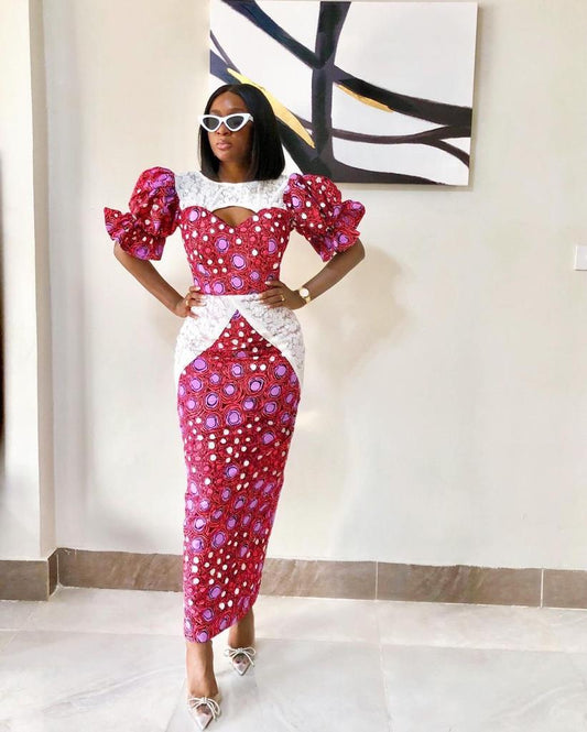 Vestido midi de talla grande estilo africano Ankara blanco y rojo para damas