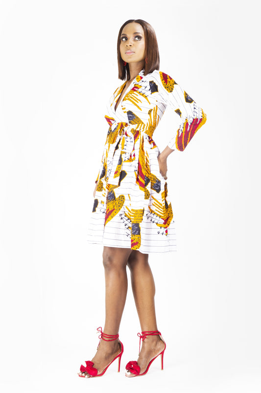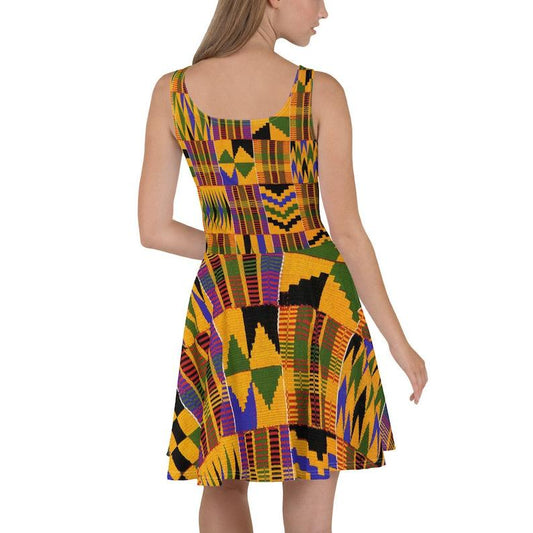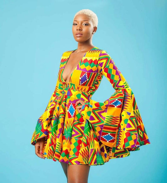 VESTIDO CORTO DE FIESTA CON ESTAMPADO KENTE AFRICANO AMARILLO MOSTAZA