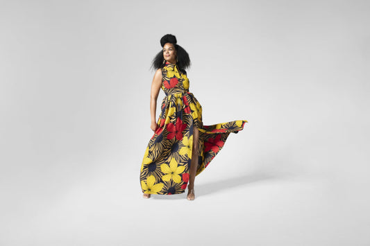 Top africano de fiesta Ankara con triple llamarada amarillo mostaza