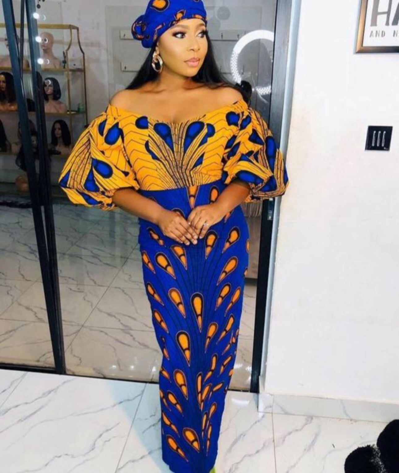 VESTIDO MAXI DE FIESTA CON ESTAMPADO ANKARA AFRICANO NARANJA REAL AZUL REAL