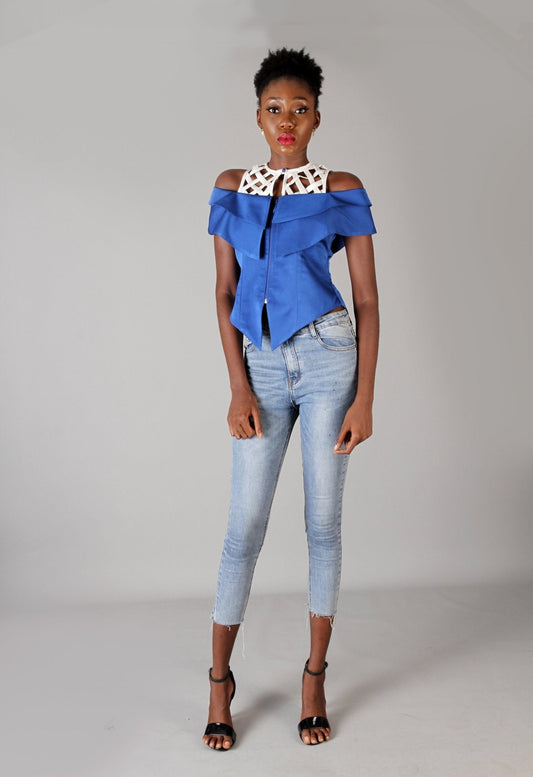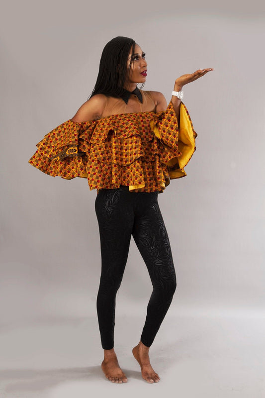 Haut de fête africain Ankara jaune moutarde triple évasé