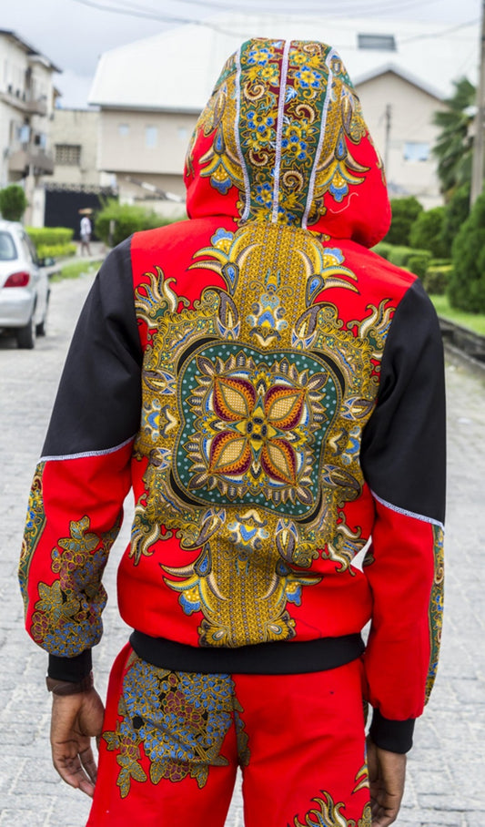 Conjunto de jaqueta Bomber e Jogger Red Yellow Multi African Ankara Print Plus Size
