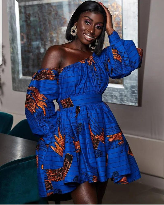 BLUE WHITE AFRICAN ANKARA PLUS SIZE FITED FORMAL SHORT PARTY WRAP DRESS