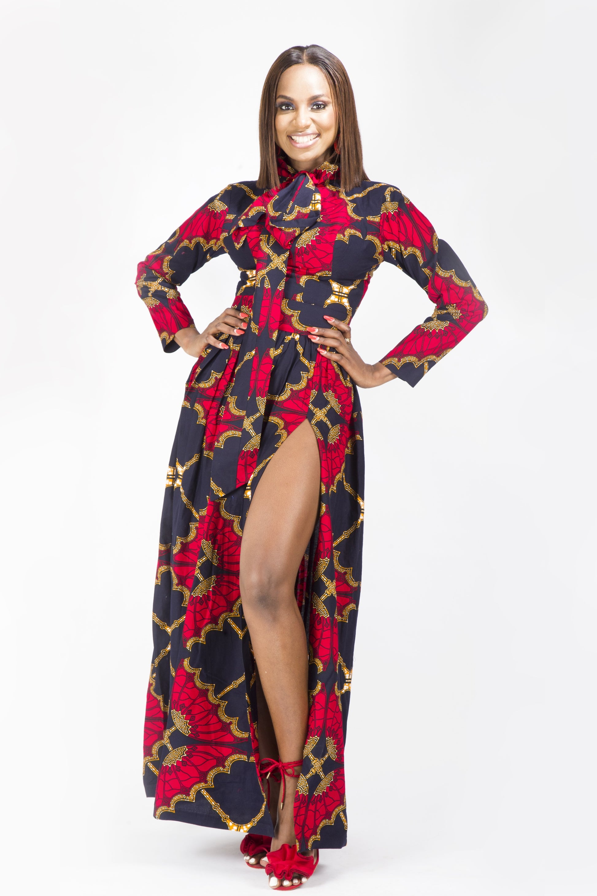 Featuring a long flowing maxi dress with a long slit in front and long sleeves with collar and tie in front. It is absolutely gorgeous and can be worn for that summer party.